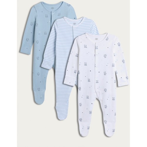 3-Pack Cotton Rich Bear Print Long Sleeved Sleepsuits in White