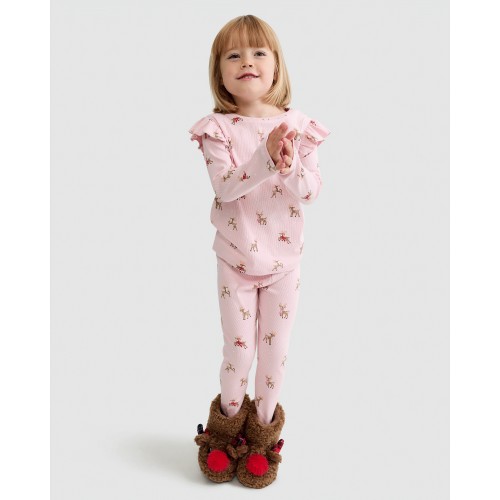 Girls Cotton Rich Reindeer Print Top and Leggings Pyjamas in Pink