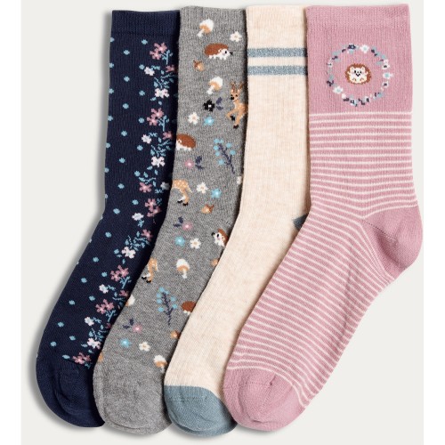 4-Pack Cotton Rich Floral and Animal Print Ankle Socks in Purple