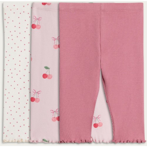 3-Pack Cotton Rich Ribbed Cherry Print Leggings in Pink