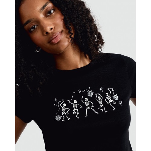 Cotton Rich Ribbed Dancing Skeletons Print T-Shirt in Black