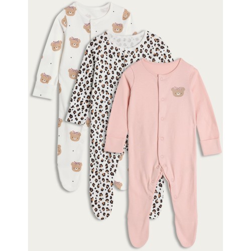 F&F Baby 3-Pack Pure Cotton Bear Print Sleepsuits in Pink