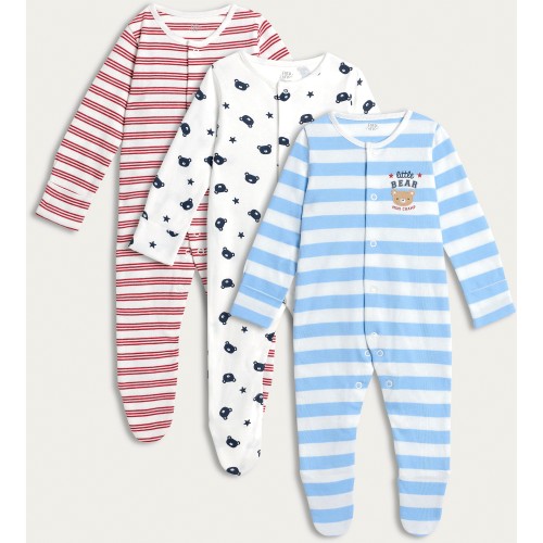 F&F Baby 3-Pack Pure Cotton Little Bear Long Sleeved Sleepsuits in Blue