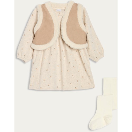 3-Piece Faux Fur Gilet Dress and Tights Set in Stone