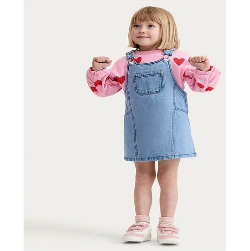 F&F Girls 2-Piece Cotton Rich Heart Print Sweatshirt and Denim Pinafore Dress Set in Blue