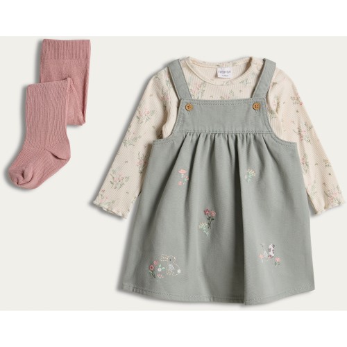 3-Piece Floral Pinafore Bodysuit and Tights Set in Green