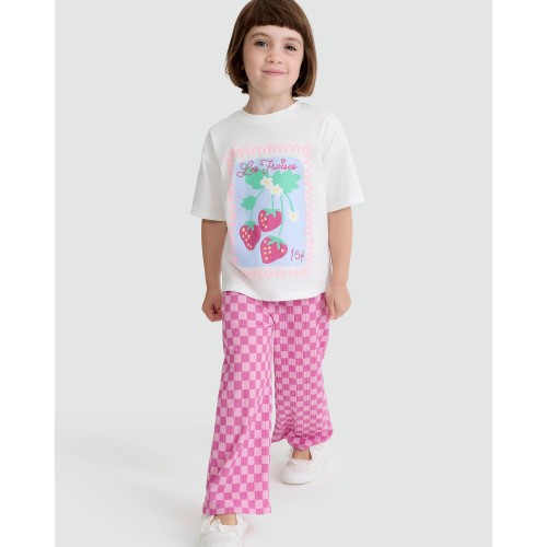 F&F Girls 2-Piece Les Fraises T-Shirt and Check Trousers Set in Multi