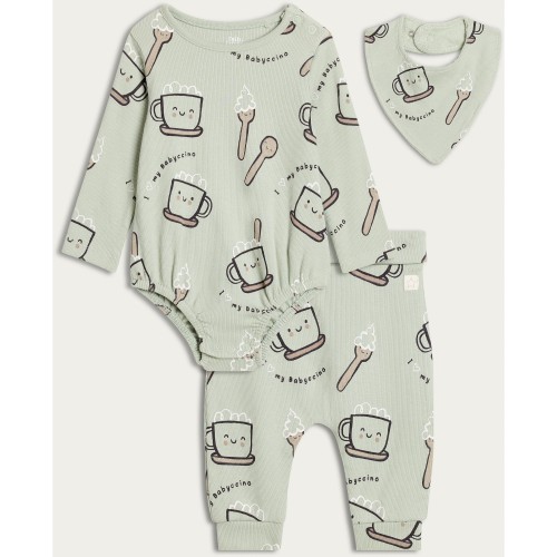 3-Piece Cotton Rich Babyccino Bodysuit Legging and Bib Set in Green