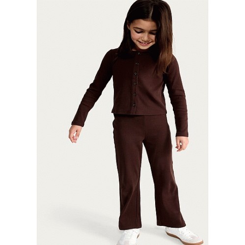 F&F Girls 2-Piece Cotton Rich Ribbed Cardigan and Trousers Set in Brown