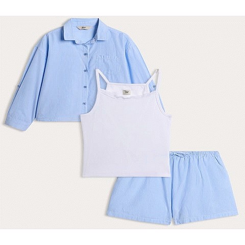 F&F Girls 3-Piece Cotton Rich Shirt Vest & Shorts Set in Blue