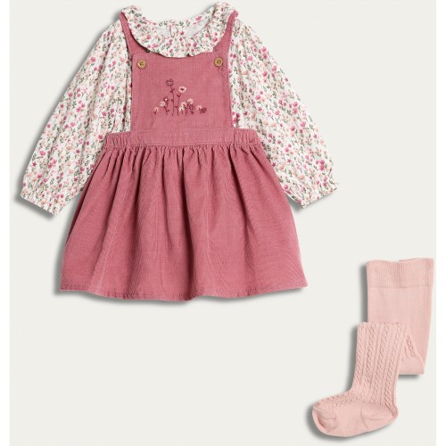 3-Piece Cotton Rich Floral Bodysuit Pinafore and Tights Set in Pink