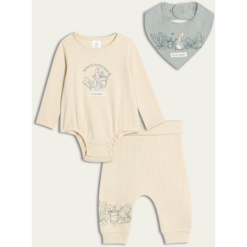 Peter Rabbit 3-Piece Pure Cotton Bodysuit Leggings and Bib Set in Stone