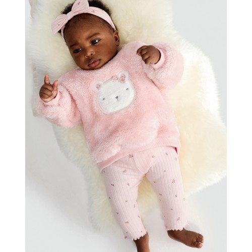 3-Piece Bear Motif Jumper Leggings and Headband Set in Pink