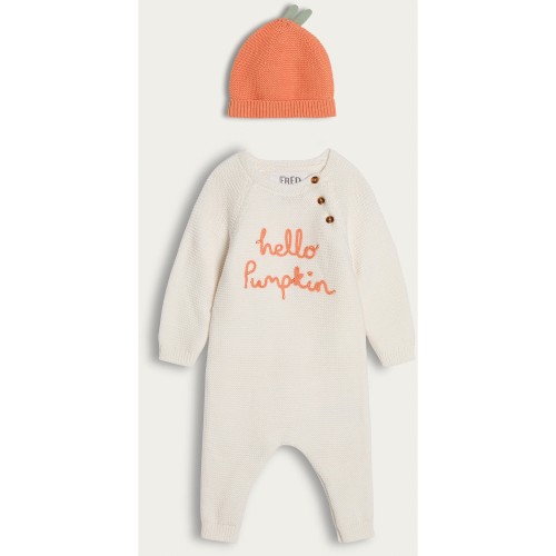 Pure Cotton Knitted Hello Pumpkin Romper and Hat in White