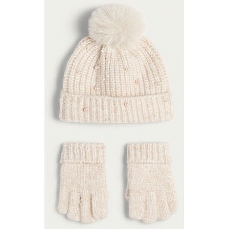 Girls 3-Piece Knitted Faux Pearl Beanie Gloves and Snood Set in Neutral