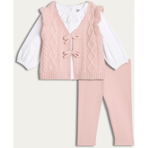 3-Piece Cable Knit Waistcoat Top and Leggings Set in Pink