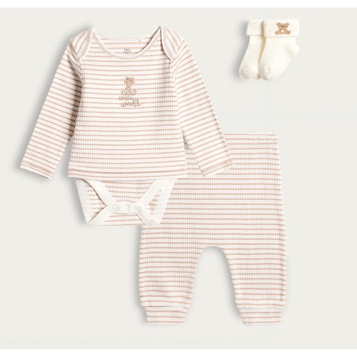 3-Piece Cotton Rich Knitted Cardigan Bodysuit and Legging Set in Med Nude