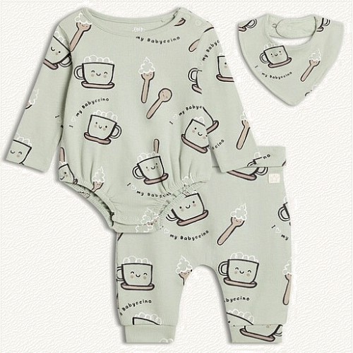 3-Piece Cotton Rich Babyccino Bodysuit Legging and Bib Set in Green