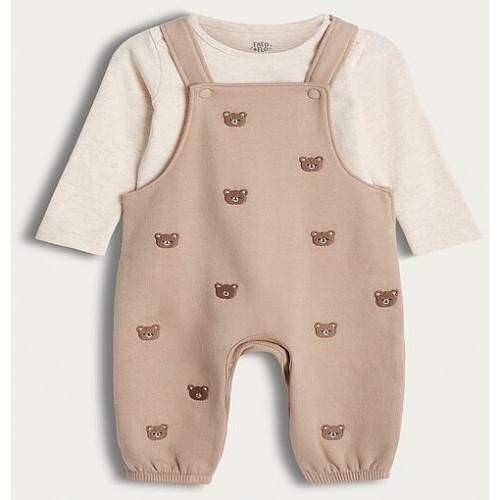 2-Piece Cotton Rich Bear Embroidered Dungaree and Bodysuit Set in Stone