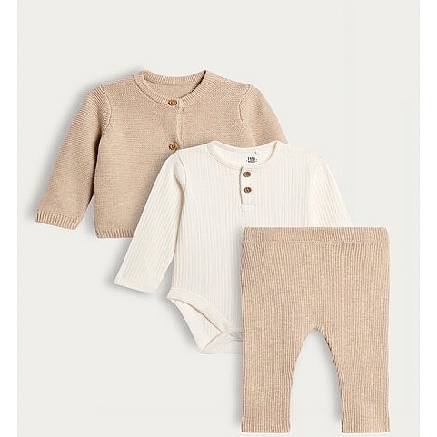3-Piece Cotton Rich Knitted Cardigan Bodysuit and Legging Set in Med Nude