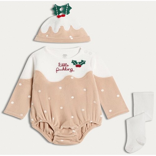 3-Piece Cotton Rich Little Pudding Bodysuit Hat and Tights Set in White