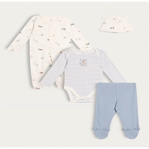 4-Piece Cotton Rich Teddy Bear Sleepsuit Bodysuit Legging and Hat Set in White