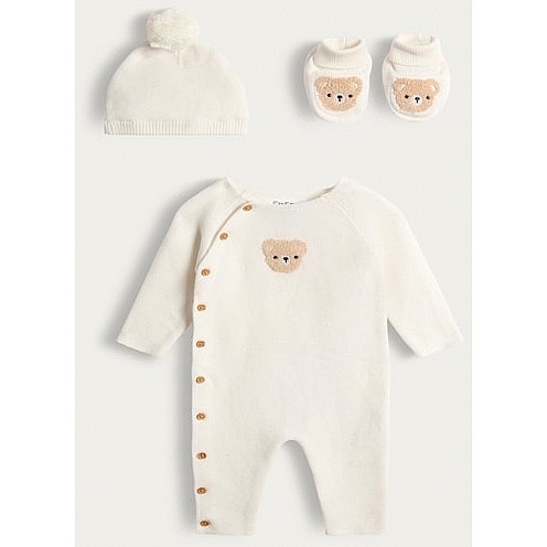 3-Piece Pure Cotton Knitted Bear Romper Hat and Bootie Set in White