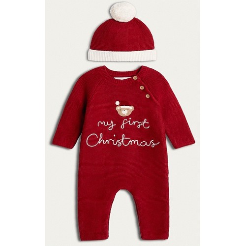 2-Piece Pure Cotton Knitted Onesie and Hat Set in Red