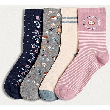4-Pack Cotton Rich Floral and Animal Print Ankle Socks in Purple