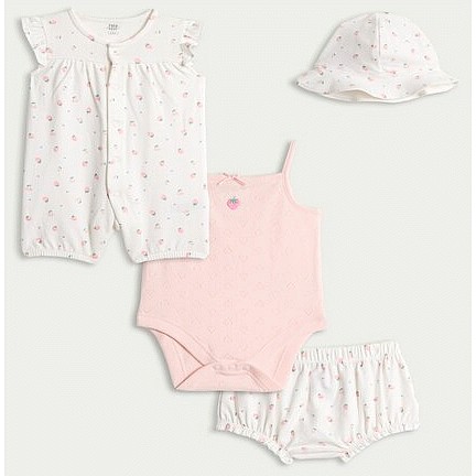 4-Piece Pure Cotton Strawberry Print Bodysuit Romper Bloomers and Hat Set in Pink