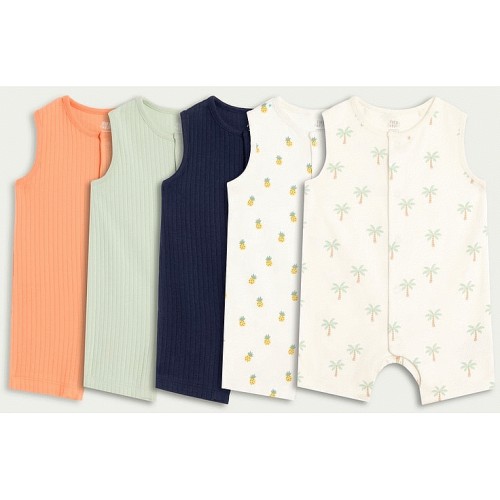 F&F Baby 5-Pack Cotton Rich Ribbed Bow Strap Rompers in Multi