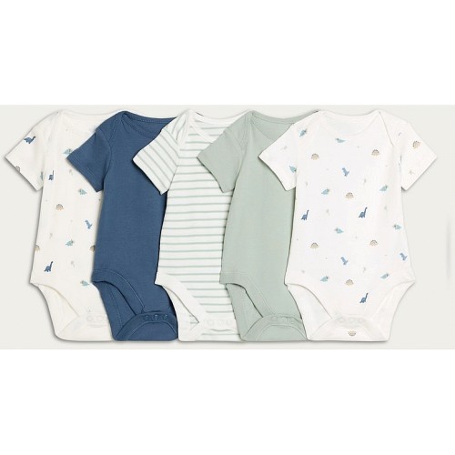 F&F Baby 5-Pack Pure Cotton Dinosaur Print Short Sleeved Bodysuits in Blue