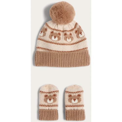 Baby 2-Piece Bear Print Hat and Mittens Set in Neutral