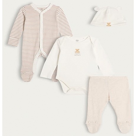 4-Piece Cotton Rich Teddy Bear Sleepsuit Bodysuit Legging and Hat Set in White