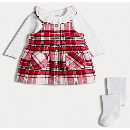 3-Piece Check Print Pinafore Bodysuit and Tights Set in Red