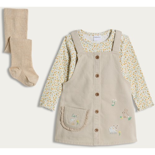 3-Piece Embroidered Pinafore Bodysuit and Tights Sets in Cream