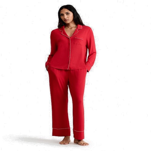 Piped Candy Cane Revere Shirt and Wide Leg Trousers Pyjamas in Red
