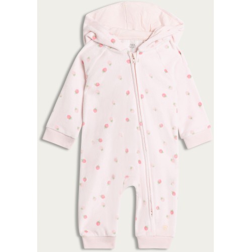 Cotton Rich Hooded Strawberry Print Sleepsuit in Pink