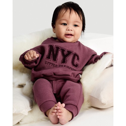 2-Piece Cotton Rich NYC Slogan Sweatshirt and Joggers Set in Burgundy