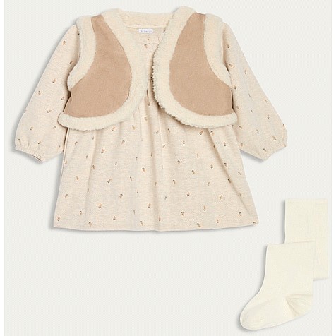 3-Piece Faux Fur Gilet Dress and Tights Set in Stone