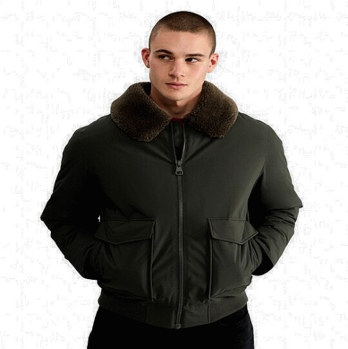 Faux Shearling Collar Shower Resistant Bomber Jacket in Khaki
