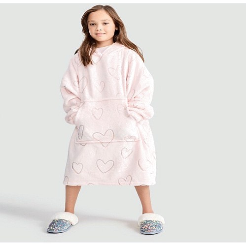 Girls Fleece Heart Print Longline Pyjama Hoodie in Pink