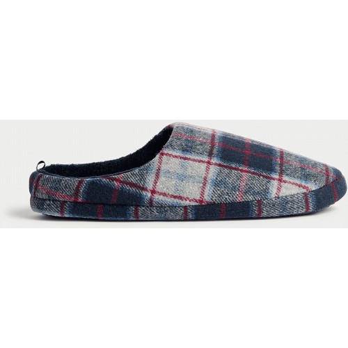 Fleece Lined Check Print Mule Slippers in Navy