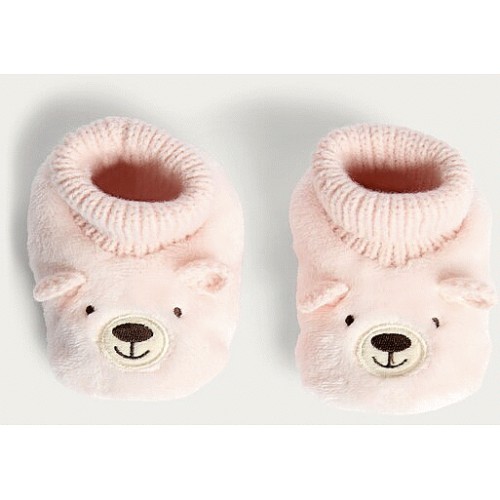 Baby Fleece Bear Face Ribbed Booties in Pink