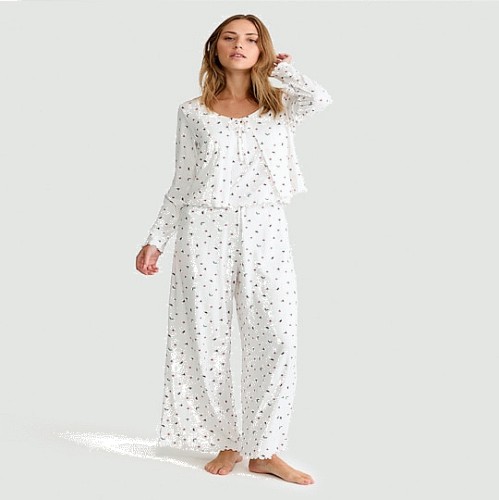 3-Piece Holly Print Tie Front Cardigan Cami and Bottoms Pyjamas in Cream