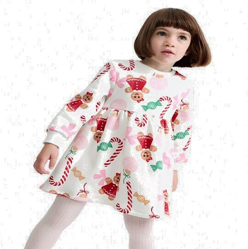 F&F Girls Cotton Rich Gingerbread and Candy Print Sweat Dress in Cream