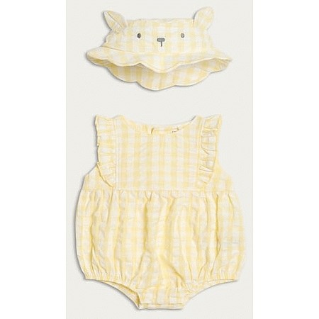 2-Piece Pure Cotton Gingham Romper with Hat in Yellow