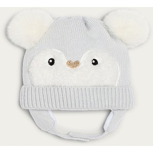 Baby Knitted Penguin Face Pom Pom Hat in Grey