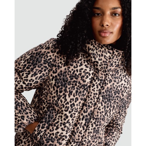 Leopard Print Shower Resistant Puffer Jacket in Multi Brown