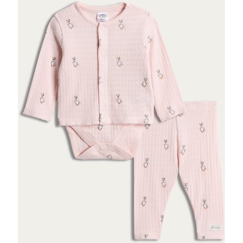 Peter Rabbit Jemima Puddle Duck 3-Piece Pointelle Cardigan Bodysuit and Leggings Set in Pink